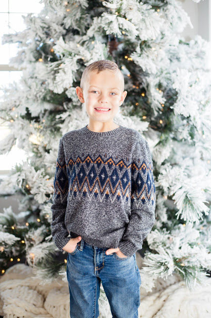 We did a quick shoot at home in front of our Christmas tree. I used to dream of having a giant flocked tree like this. No ornaments. Just simple and clean. I love, love this tree. So I was happy to get some family pictures taken with our giant tree I had dreamed of. And shooting inside during the winter is much easier on everyone (this is why I like to be very prepared and even get our family pictures done in the late summer or fall).